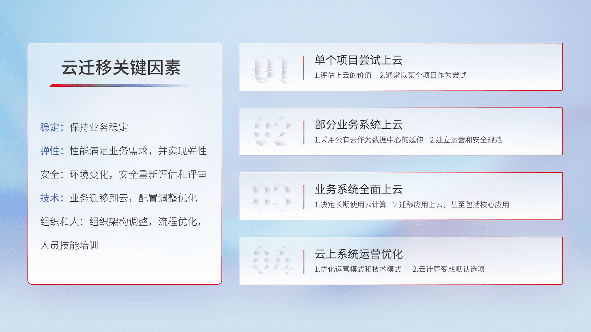 结合实际业务,,,从规划设计、、云平台选型、、、、云原生改造、、数据迁移、、集成交付,,迁移全过程为客户识别最佳上云路径,,,做好风险识别管理,,,,设计网络架构、、身份权限、、、安全审计合规、、操作审计、、、日志审计、、、监控告警策略、、、、多站点容灾设计等,,,对云上基础设施进行整体规划,,,,提升IT治理水平,,,,以满足弹性、、、高可用、、、高性能的需求。。。。