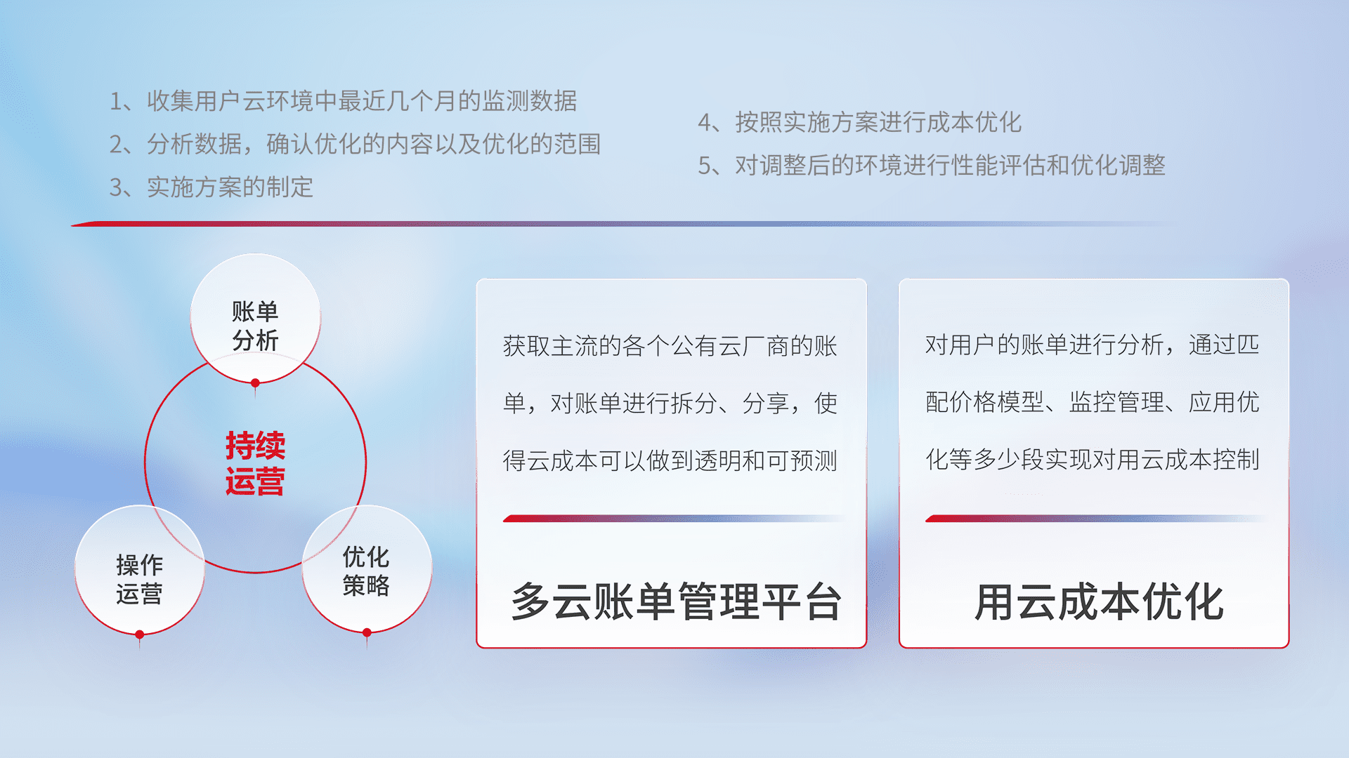 通过多云纳管,,,以统一的资源数据模型把客户的云资源进行抽象和封装,,,进而实现对多云资源的统一操作,,,,保障云资源管理的可靠性、、稳定性与可用性。。量身定制化运维内容,,,,配置、、、开发运维、、、补丁管理、、、备份、、、监控、、认证和访问管理、、、审计和日常巡检等,,,保障在用云过程中的可靠度,,稳定度以及高可用率。。。。